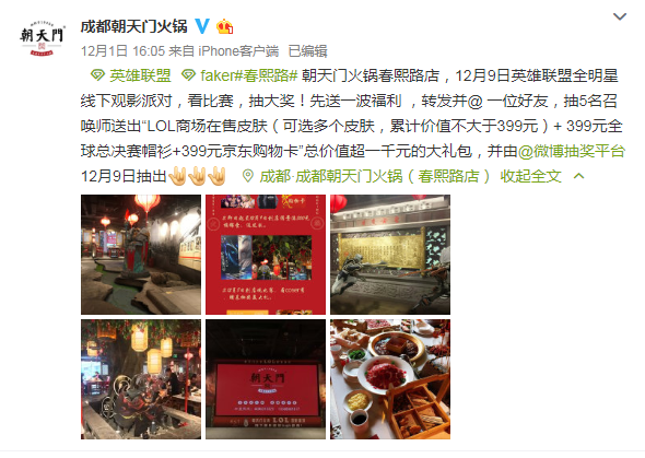 朝天門火鍋春熙路店,12月9日英雄聯(lián)盟全明星線下觀影派對(duì),看比賽,抽大獎(jiǎng)!先送一波福利 ,轉(zhuǎn)發(fā)并@ 一位好友,抽5名召喚師送出“LOL商場(chǎng)在售皮膚(可選多個(gè)皮膚,累計(jì)價(jià)值不大于399元)+ 399元全球總決賽帽衫+399元京東購(gòu)物卡”總價(jià)值超一千元的大禮包,并由@微博抽獎(jiǎng)平臺(tái) 12月9日抽出
