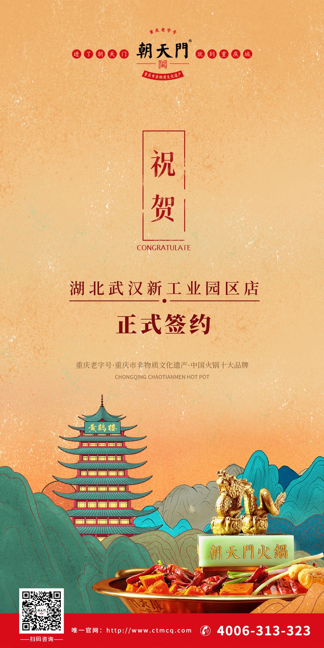 在此,我們?nèi)f分感謝黃總對朝天門火鍋的信任,接下來,集團十二大部門將全力以赴,為黃總的火鍋店做好籌備工作,保障順利開業(yè)。祝生意興隆,財源滾滾!